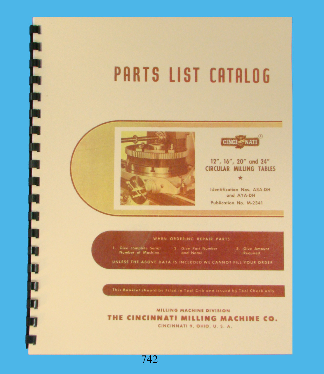 Description: This is a Parts List Manual for the Cincinnati Circular Milling Tables Sizes 12" , 16" , 20" & 24". It contains information on the Specifications, How to Set Up the Circular Milling Table, Index Tables for Standard Index Plates, Index Tables for High Number Index Plates, Table of Feed Rates, Adjustments, Exploded Parts Views and Parts List. It has 49 pages. To inspect the quality of the manual, to view the Table of Contents, and to view select pages, please click on the gallery images above to enlarge.