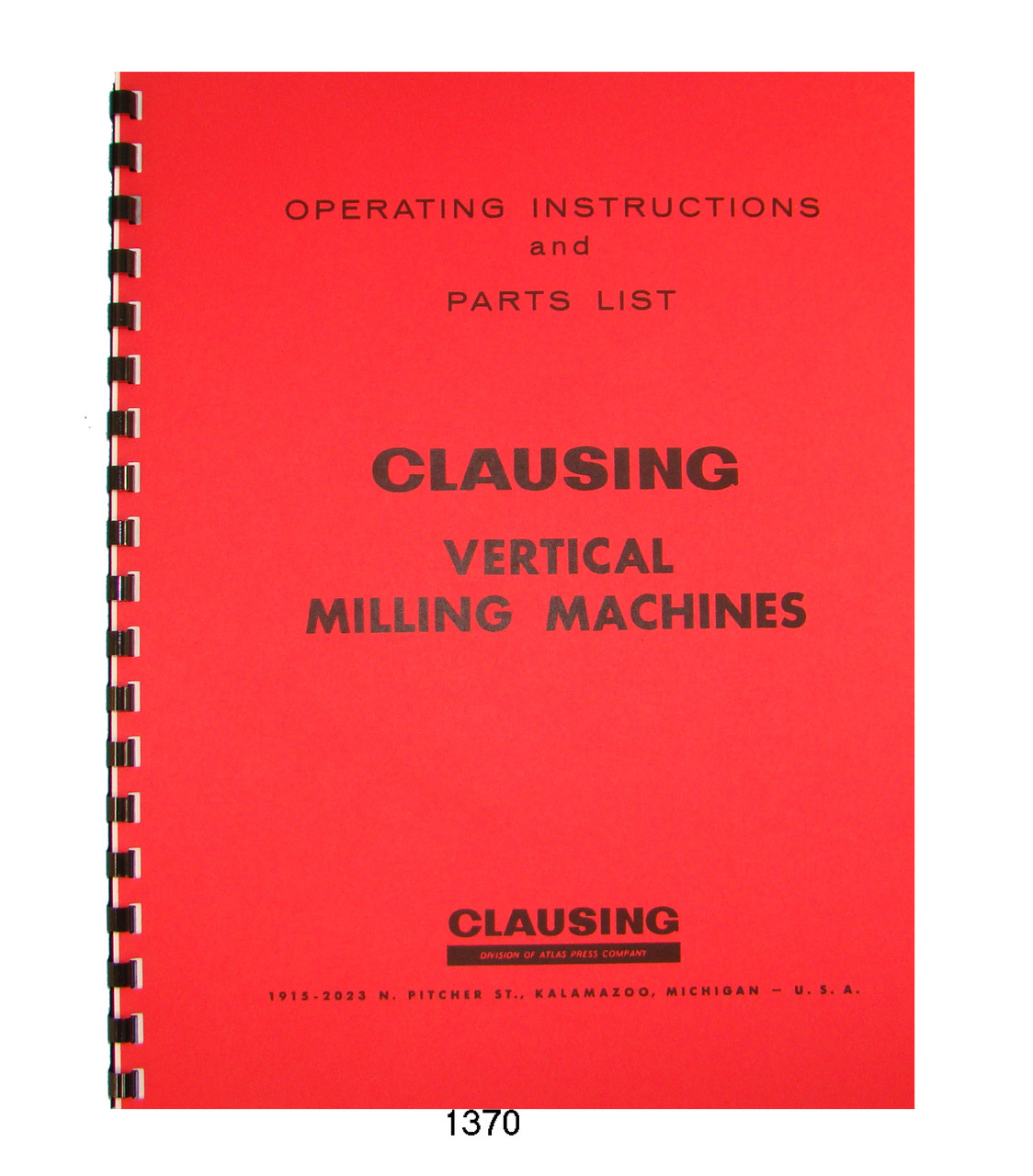 Description: This manual covers the Clausing Vertical Milling Machines 8520 & 8525. It covers the Installation, Control Operations, Spindle Speeds, and has an complete parts breakdown and parts list. It has 8 pages. To inspect the quality of the manual, and to view select pages, please click on the gallery images above to enlarge.