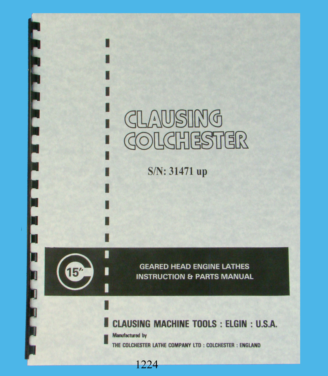 Description: This is an Instruction, Maintenance, and Parts List Manual for the Clausing Colchester 15" Geared Head Engine Lathe. It contains instructions on the Installation, Operation, Lubrication, Maintenance, Adjustments, Specifications, Wiring Diagram, Parts Lists, and Exploded Parts Views. The manual has 68 pages. To inspect the quality of the manual, to view the Table of Contents, and to view select pages, please click on the gallery images above to enlarge.