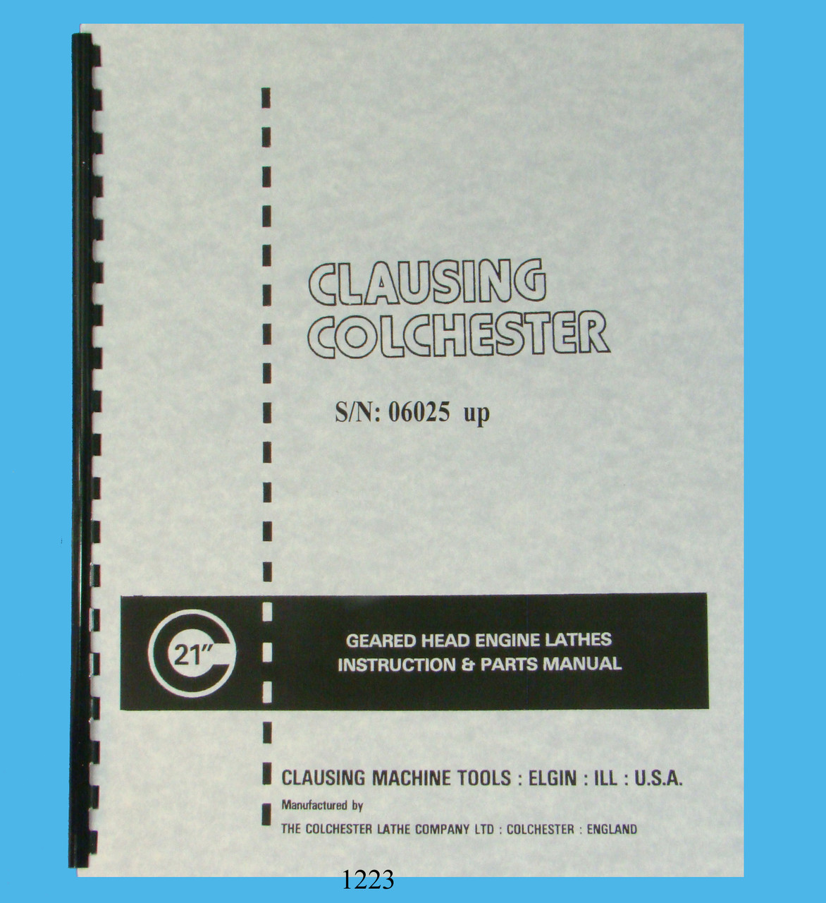 Description:This is an Instruction & Parts List Manual for the 21" Clausing Colchester Lathe beginning with serial number 06025 and up. It has instructions on Operation, Controls, Installation, Lubrication, Adjustments, Alignment, Wiring Diagram, complete Exploded Parts Views including the Parts List, Rapid Threader, Taper Turner, & Tool Posts. The manual has 68 pages. To inspect the quality of the manual, to view the Table of Contents, and to view select pages, please click on the gallery images above to enlarge.