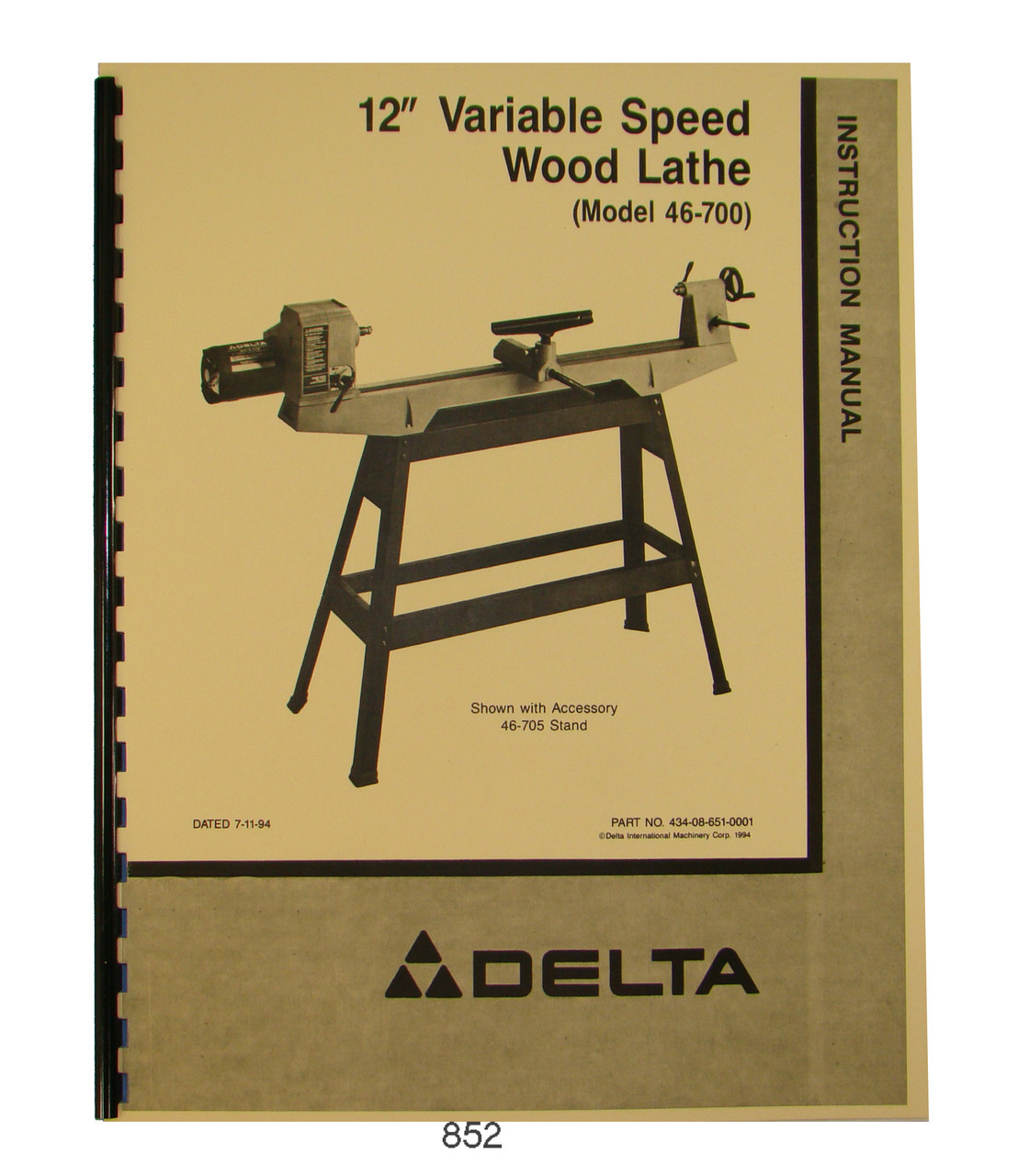Description: This manual is an Operator Instruction & Parts List Manual for the Delta Variable Speed 12" Wood Lathe. It covers the Assembly, Operating Controls, Adjustments, Spindle Speeds, Lathe Operations and Cuts, Maintenance, and it has a complete Parts Breakdown and Parts List. It has 32 pages. To view the Table of Contents, to inspect the quality of the manual, and to view select pages, please click on the gallery images above.