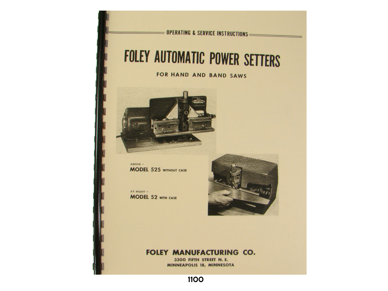 Description:This manual covers the Foley Models 525 & 52 Automatic Power Setters for Hand Saws and Band Saws. It has sections on: Assembly Instructions, Operating Instructions, Service Instructions, Adjusting the Feed Mechanism, Adjustment of Gibs, and more. It has an exploded parts view and parts list for the power setters and Circular Saw Setter #353000. It has 18 pages. To inspect the quality of the manual, and to view select pages, please click on the gallery images above to enlarge.