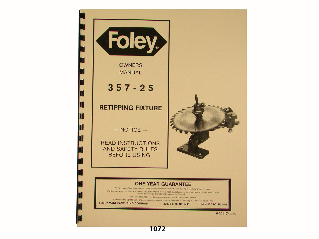 Description: This manual covers the Foley Model 357-25 Retipping Fixture. It shows how to Remove and Replace carbide tips on saw blades, and has an exploded parts diagram and parts list. It has 16 pages. To inspect the quality of the manual, to view the table of contents, and to view select pages, please click on the gallery images above to enlarge.