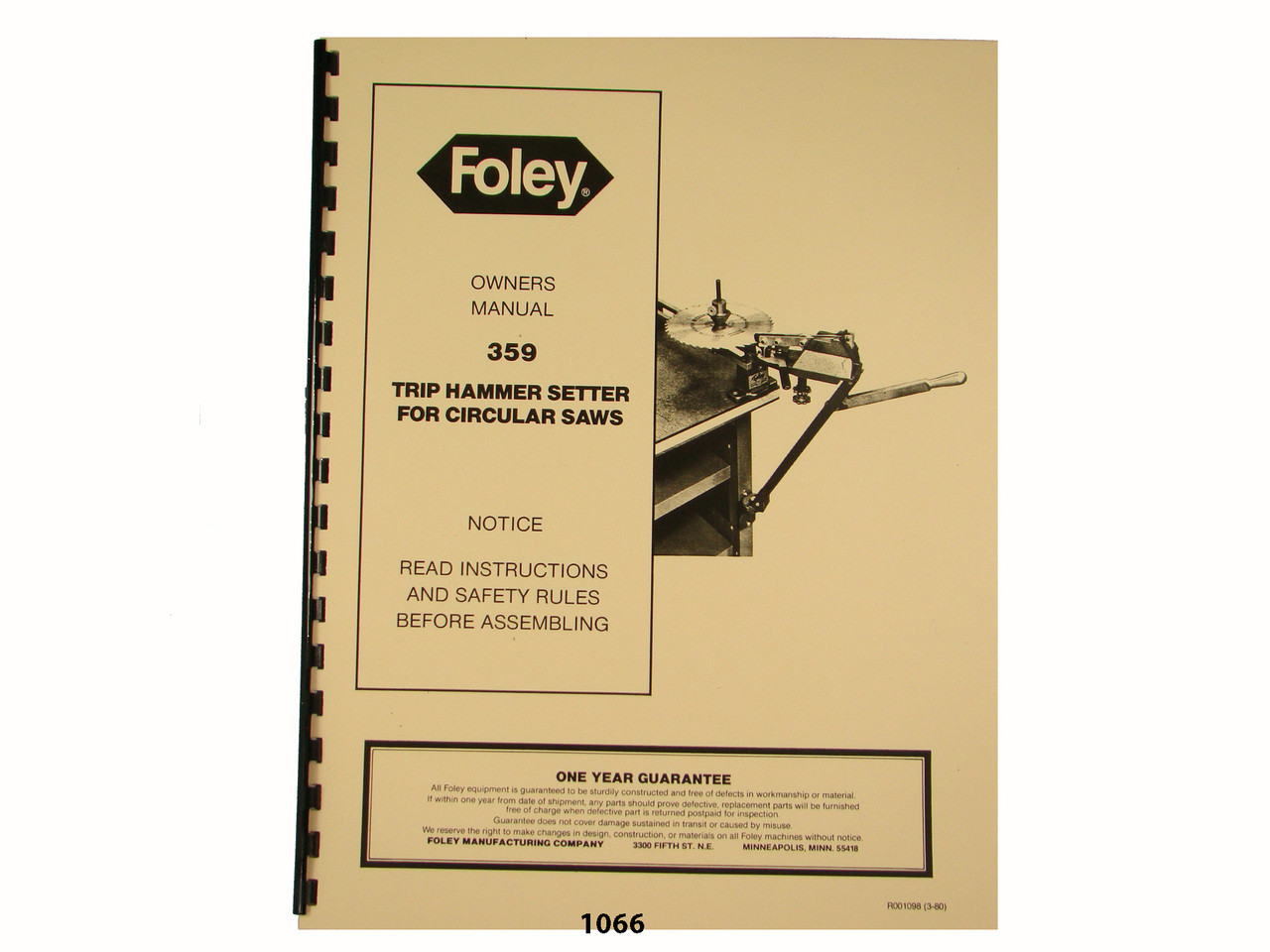 Description: This manual covers the Foley Model 359 Trip Hammer Setter for Circular Saws. It contains the operating instructions, helpful hints, & lubrication & maintenance. It also has an exploded parts diagram and parts list. It has 12 pages. To inspect the quality of the manual, to view the table of contents, and to view select pages, please click on the gallery images above to enlarge.