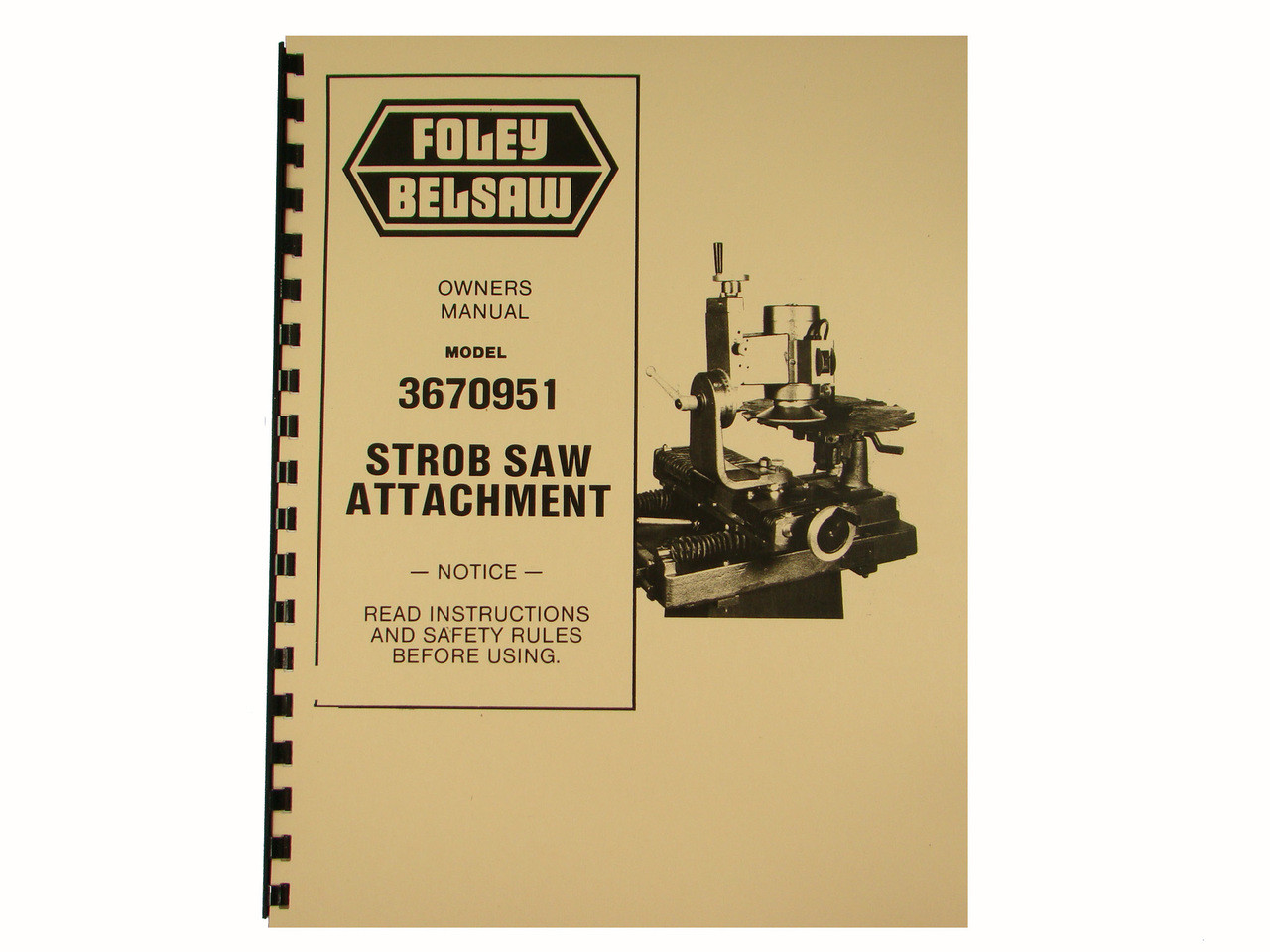 Description: This manual covers the Foley Model 3670951 Strob Saw Attachment. It shows how to grind strob teeth, and has sections on: Operating Instructions, Assembly Instructions, Maintenance & Lubrication, General Information, and has an exploded parts diagram and parts list. It has 18 pages. To inspect the quality of the manual, to view the table of contents, and to view select pages, please click on the gallery images above to enlarge.