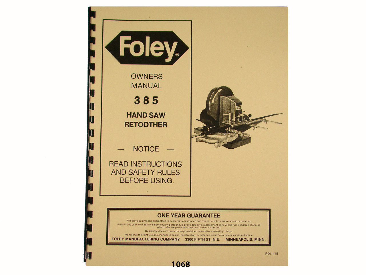 Description: This manual covers the Foley Model 385 Hand Saw Retoother. It explains how the retoother works, how to operate it, maintenance, lubrication & adjustments. It gives solutions for various machine malfunctions. It also has an exploded parts diagram and parts list. It has 20 pages. To inspect the quality of the manual, to view the table of contents, and to view select pages, please click on the gallery images above to enlarge.