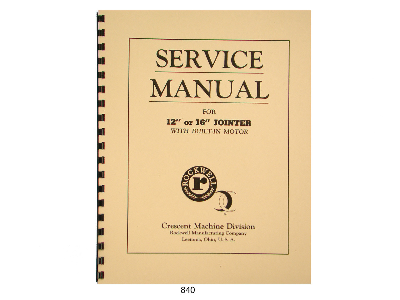 Description: This manual covers the Rockwell/Crescent Jointer 12" & 16" models . It covers: Knife Grinding and Jointing Devices, Cleaning and Inspection of Electric Motors, parts view, and parts lists. It has 17 pages. To inspect the quality of the manual and to view select pages, please click on the gallery images above to enlarge.