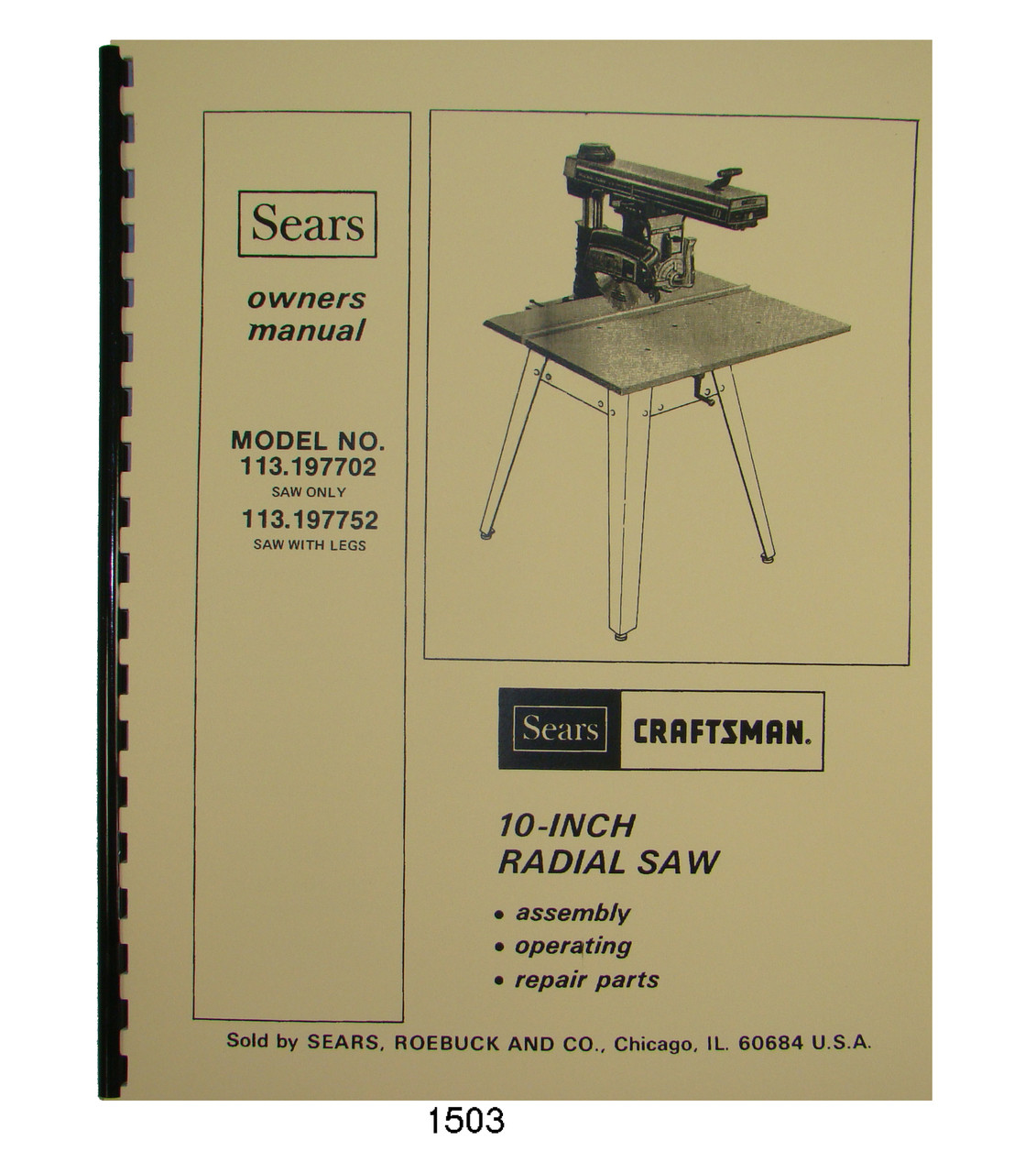 Description: This manual covers the Sears Craftsman 10" Table Saw models 113.197702 & 113.197752. It covers Assembly, Alignment, Operation, Maintenance, Lubrication, Basic Saw Cuts, Troubleshooting, and it has a Parts Breakdown and Parts List. It has 43 pages. To inspect the quality of the manual, and to view select pages, please click on the gallery images above.