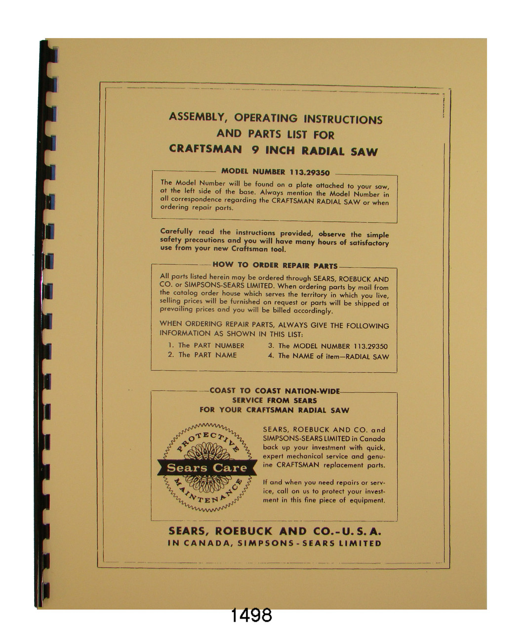 Description: This manual is for the Sears Craftsman 9" Radial Arm Saw. It covers Safety Instructions, Assembly, Alignment Procedures, Operation, Troubleshooting, Maintenance, and it has a complete Parts Breakdown and Parts Lists. It has 24 pages. To inspect the quality of the manual, and to view select pages, please click on the gallery images above to enlarge.