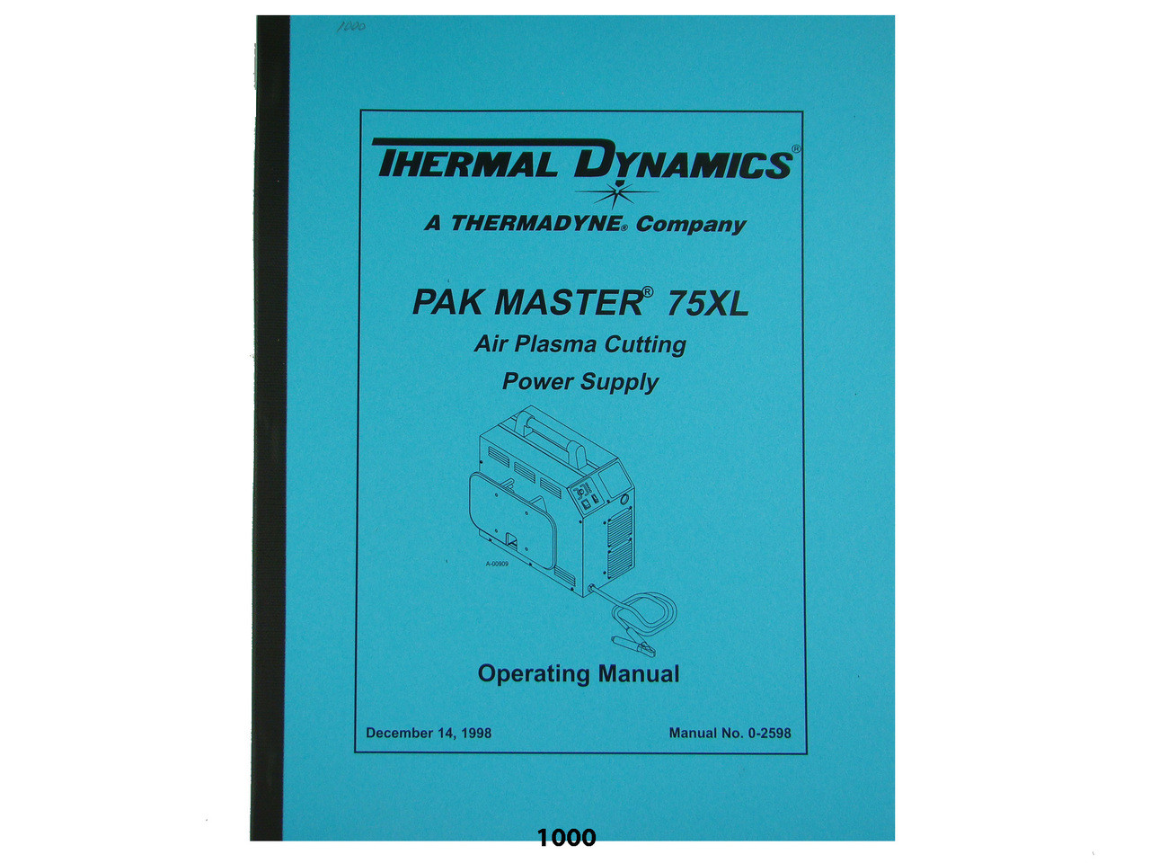 Description: This is a Operating Manual for the model 75XL Pakmaster plasma cutter. It has instructions on Operation, Customer Servicing, Troubleshooting, Sequence of Operation, Wiring Diagrams, & Installation, The manual has 44 pages. To inspect the quality of the manual, view the table of contents, and to view select pages, please click on the gallery images above to enlarge.