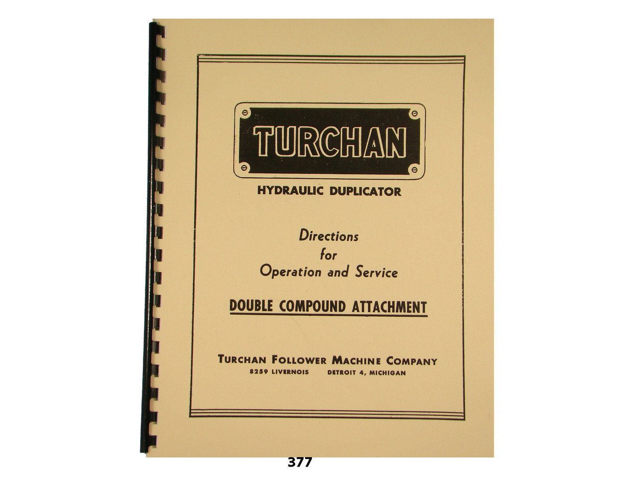 Description: This is an Operation and Service manual for the Turchan Hydraulic Duplictor Double Compound Attachment. It has sections on: General Construction, Operation of Complete Circuit, Method of Turning with Dual Turn, Hydraulic Power Unit, Setting Pressures, Oil Specifications, Power Feed, Tracer Valve, Feed Adjustment, Setting Up, & Tracer Tips. It has 21 pages. To inspect the quality of the manual, and to view select pages, please click on the gallery images above to enlarge.
