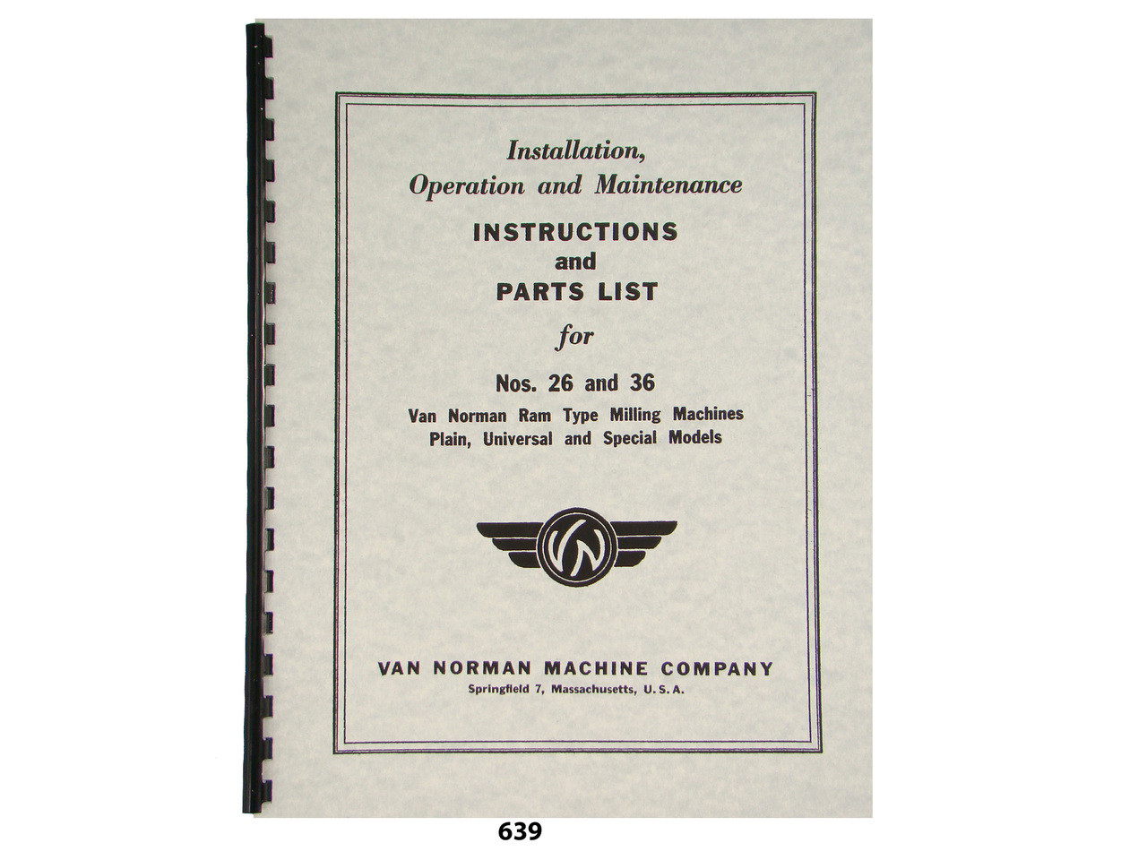 Description: This is an Operation, Maintenance, & Parts List Manual for the Model 26 & 36 Van Norman Milling Machine. It has sections on Installation, Lubrication, Operation, & Adjustments. It has a complete set of exploded parts views and parts list. The manual has 22 pages. To inspect the quality of the manual, view the table of contents, and to view select pages, please click on the gallery images above to enlarge.